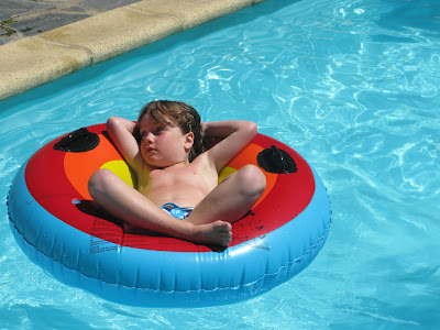 Pool activities got crazier by the day. The kids stayed up late with us tonight to watch out for shooting stars (in the picture they were painting their shooting star box). The first week we'd seen them aplenty, and in one night I remember seeing six. But of course, after all the swimming, the children were all knackered and crashed out one by one on the outdoor sofa.