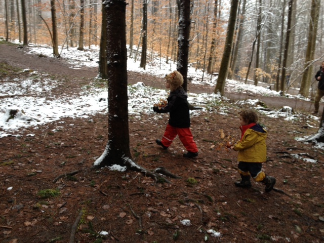 After a week off Kindergarten "krank", it was back for Bea this morning. It was also a "Besuchstag" which is basically open doors for parents this week. I nipped in twice to see what he was up to. Again, it all seems very gentle and relaxed, with songs, stories and freeplay and the allocation of small responsibilities (tidying up, handing out everyone's snack bags, etc.). Depending on your perspective it can seem too relaxed (no reading, writing, sums, or desks to sit at), yet after speaking with someone whose child was brought up in Germany this week, they consider the Swiss Kindergarten system in comparison too formal and regimental ("children should be left to simply explore and be children")! But he seems happy there, and very popular. The pic at the top is Bea this morning with his woodwork. With papa away, we were let loose on his power tools yesterday (Bea showed me how to change a drill bit!).